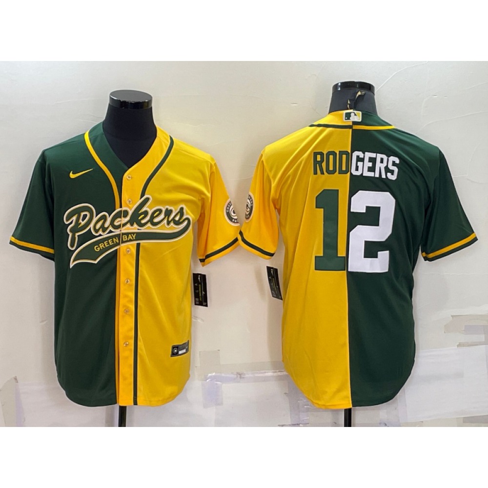 Men's Green Bay Packers #12 Aaron Rodgers Green/Yellow Split With Patch Cool Base Stitched Baseball Jersey