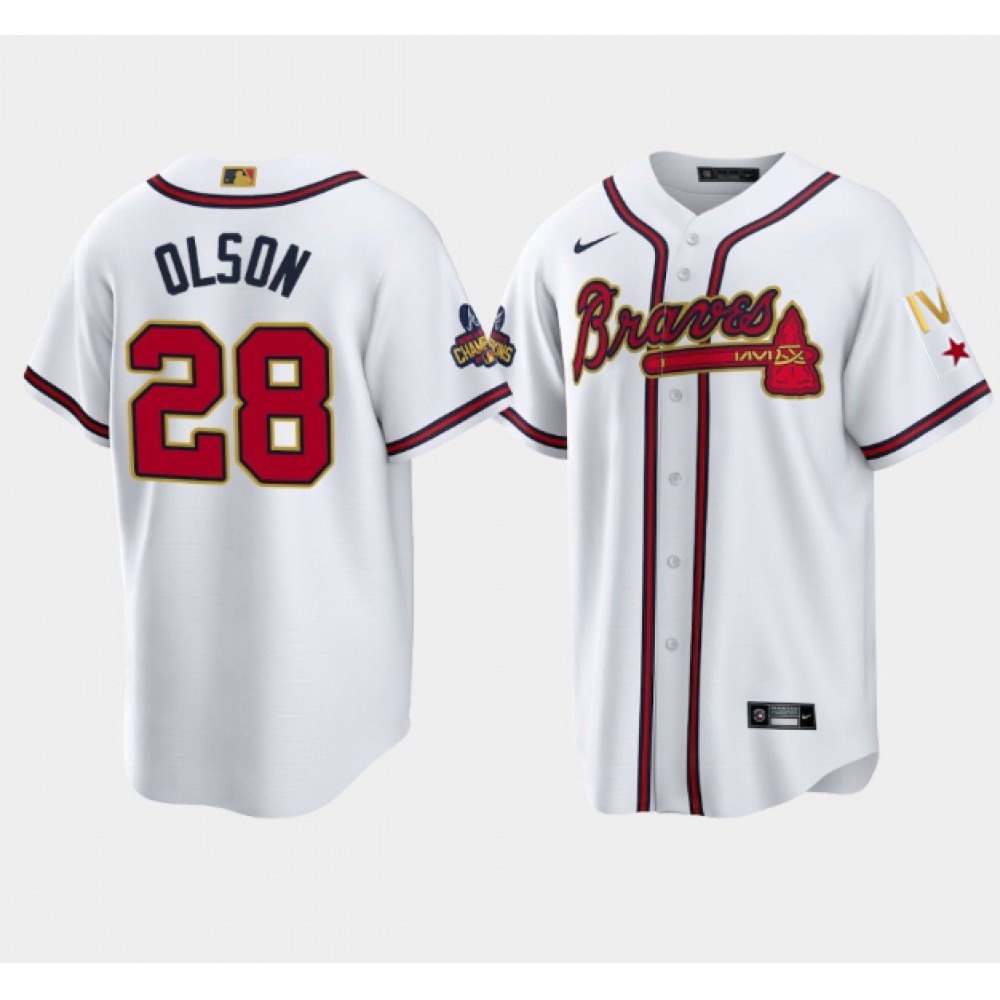 Men's Atlanta Braves #28 Matt Olson 2022 White/Gold World Series Champions Program Cool Base Stitched Baseball Jersey