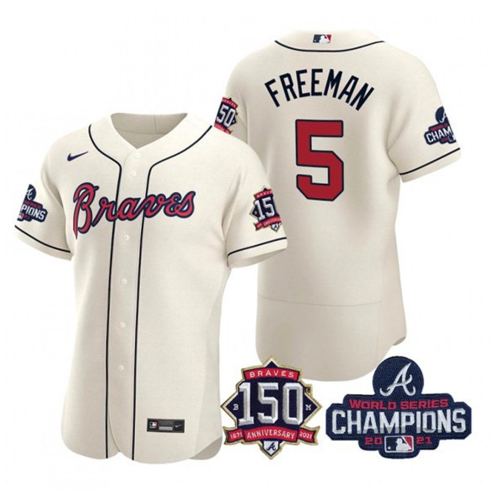 Men's Atlanta Braves #5 Freddie Freeman 2021 Cream World Series Champions With 150th Anniversary Flex Base Stitched Jersey